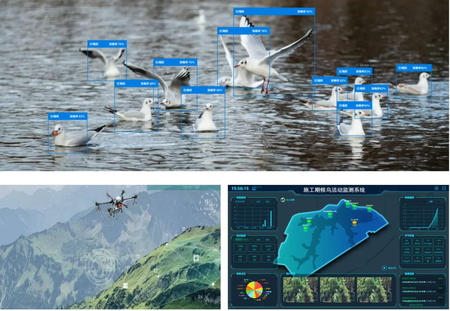 绿色环保展区针对沉湖湿地生态保护需求,建立鸟类迁徙、鱼类产卵期动态监测机制,研发基于人工智能的候鸟活动监测系统,利用高清摄像头、声音传感器和 AI 算法,检测鸟类聚集或敏感行为,通过水质监测设备采集水温等关键信息,并针对性调整施工计划,确保工程建设与自然环境和谐共存。