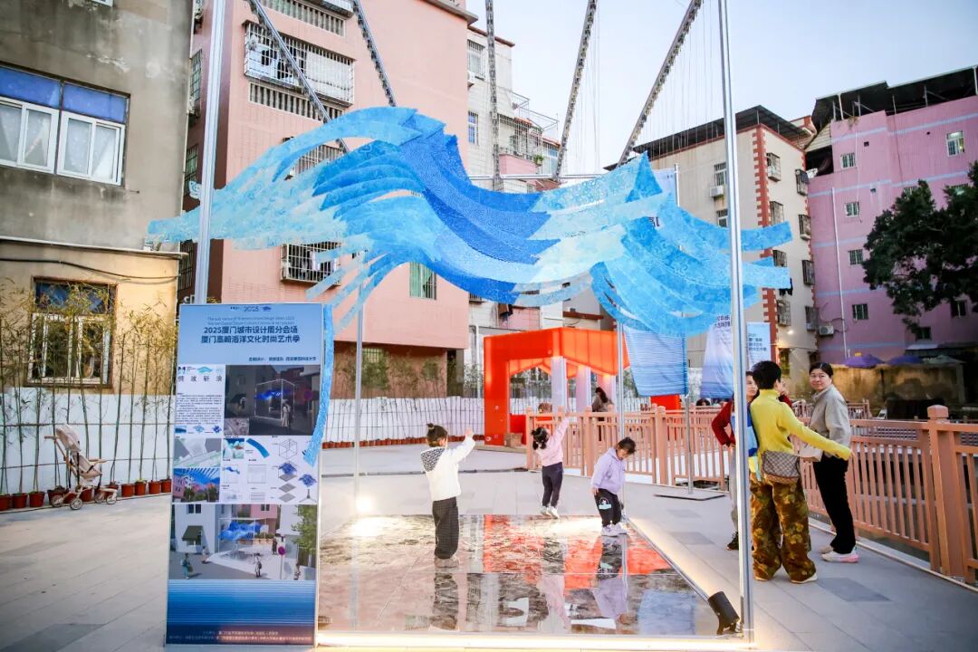 艺术季期间,古寨墙下的装置复刻海潮律动,3D 打印浪影与竹编渔网交织古今,互动绳墙可编织祈福心愿,天桥上的轻构艺术模拟浪涛起伏,涵洞剪影定格城市流动光影。项目联合清华大学、同济大学等多所高校的设计团队,以海洋文化、地域记忆与城市共生为灵感,打造了 19 个散落于公共空间的艺术装置。通过 “巧妙遮蔽外露电箱”“回收塑料瓶”“废弃的船木再设计” 等方式,将艺术欣赏、空间探索与社区导览融为一体。
