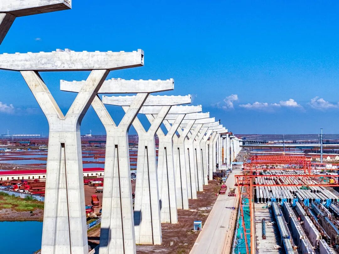 为防止海域高盐环境侵蚀,项目在临时围堰外侧加设1万米土工布,保证围堰四周海水“进不来”,应用沿海地区特有的车载拖拉机轴流泵,单台抽水效率可达每小时5千方,让路基存水和地下渗水“出得去”,攻坚盐冻环境特大桥抗滑长寿命钢桥面铺装、高浓度盐池路基填筑等技术,保障“海上道路”耐久坚固。
