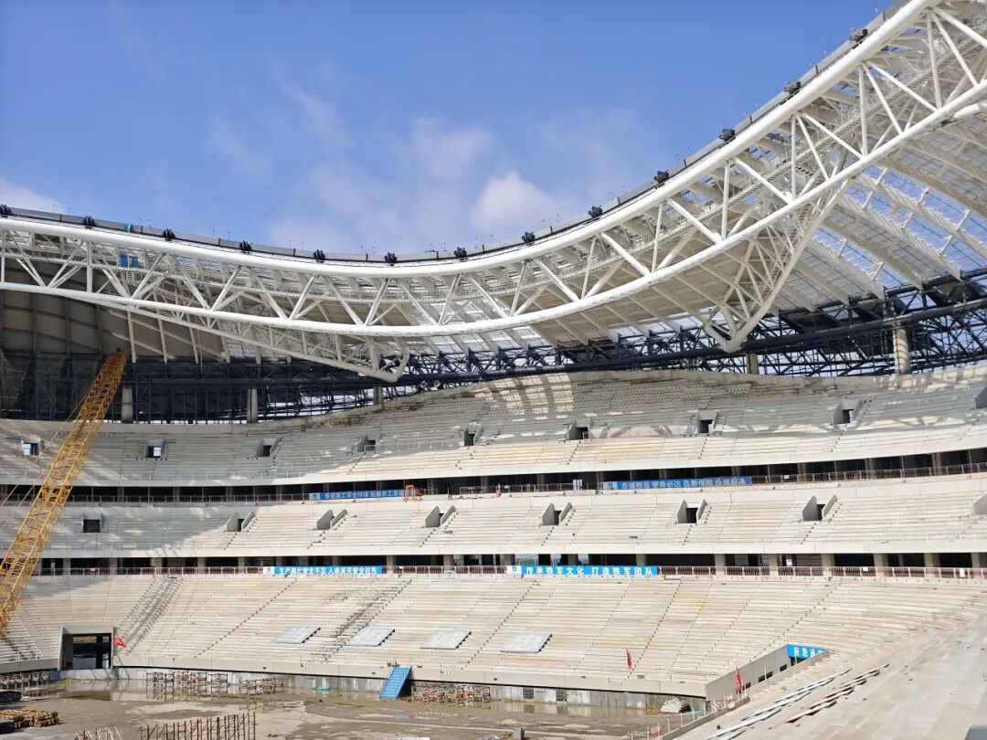 后续工程稳步推进 膜结构施工将启。目前,项目屋盖钢结构已全部施工完成,屋面与幕墙结构正同步推进,建筑轮廓如同 “黄河明珠” 般在黄河之畔熠熠生辉。下一步,施工团队将在看台上安装人体工学观赛座椅,进一步优化观赛舒适度。