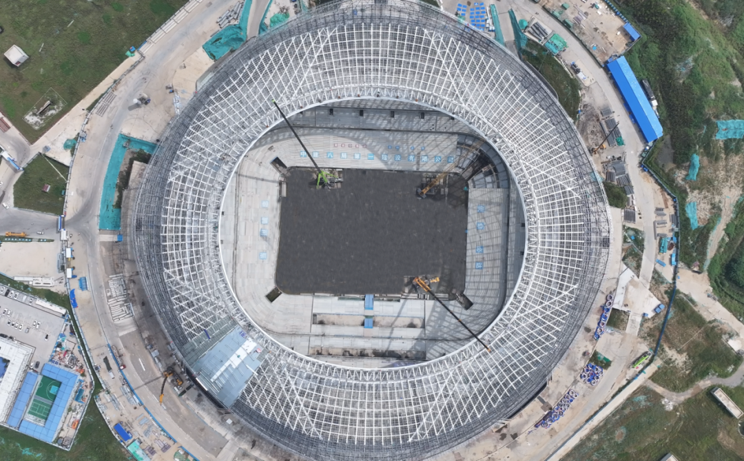 同时,项目正全力推进金属屋面、防水层、隔音层等部位施工,即将进入难度较大的膜结构施工阶段。屋盖内环将打造一圈 “透明屏障”,为足球场提供更优的光照条件,进一步提升观赛体验。