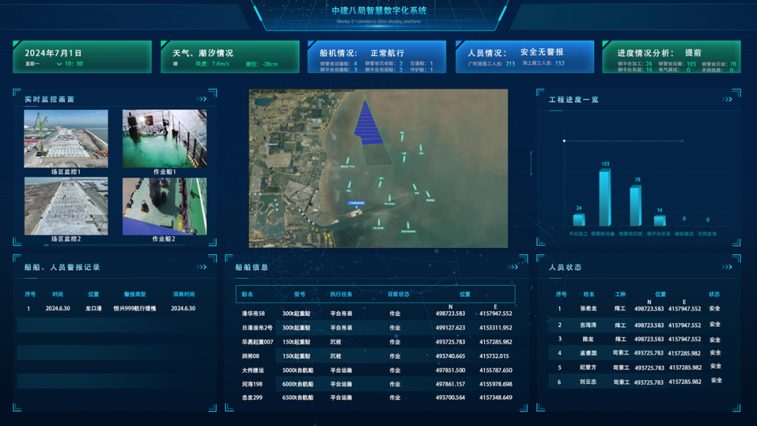 为保障海上施工安全,项目打造海上光伏施工智能监管平台,整合天气、环境、人员、船机、物料等信息,实现作业船只航迹监控调度、物料及关键工序进度监管等功能,达成管理可视化。同时,项目研发智能潮位监测系统和智能风浪预测系统,结合实时监测与历史规律分析实现高精度趋势预测,全面应用无人机和无人船巡检,构建 “天 - 空 - 海 - 地” 全域施工监控。此外,项目还研发自动脱钩缓降分配吊架以规避高空解钩风险,为夜间赶潮施工人员配备安全肩灯,守护作业安全。