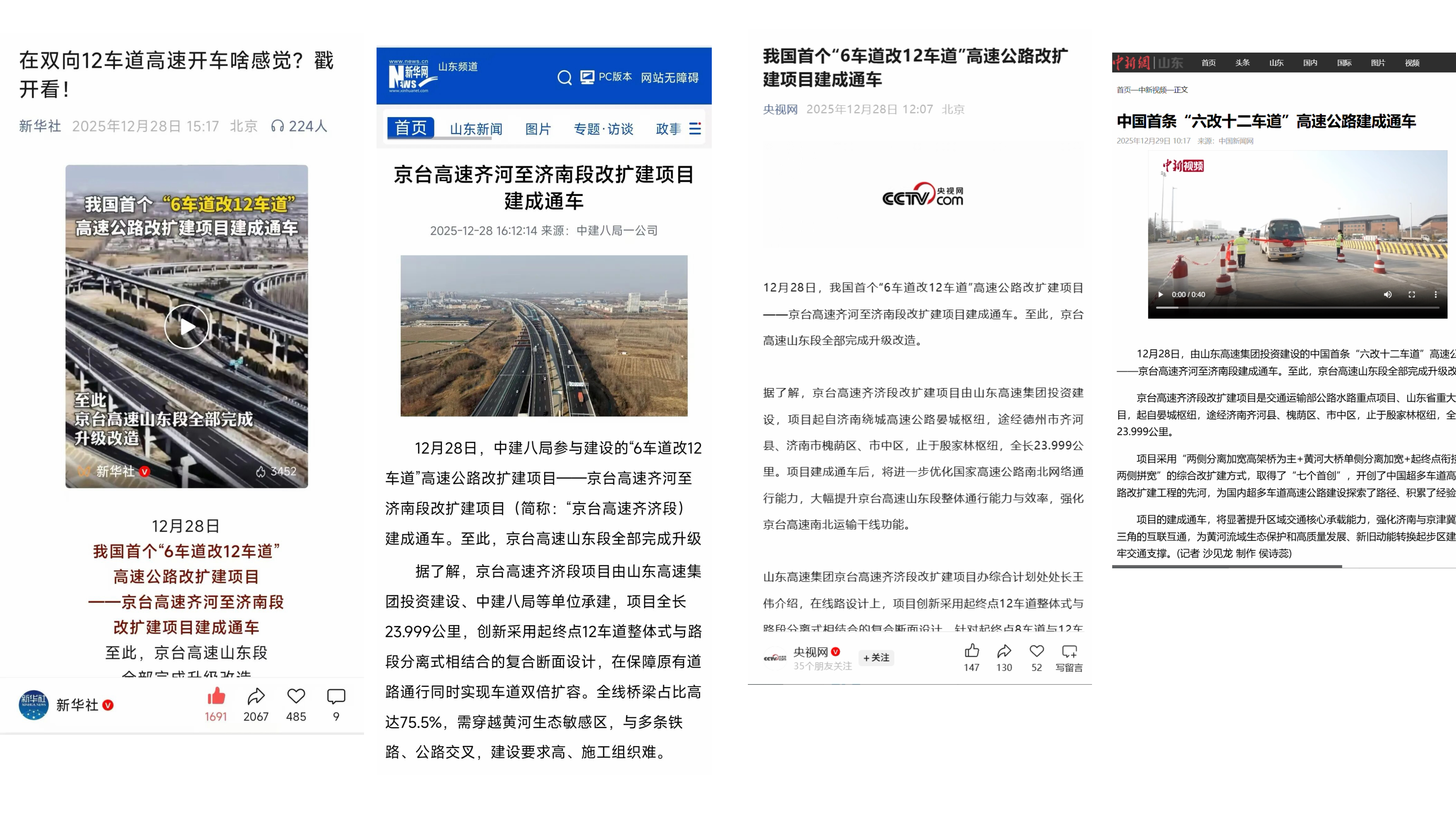 12月28日,由中建八局承建的国内首条“6改12”高速公路项目——京台高速齐济段改扩建项目建成通车。至此,京台高速山东段全部完成升级改造,日均通行能力提升至约15万辆次,对优化国家高速公路南北网络通行能力具有重要意义。