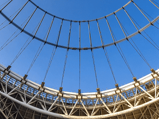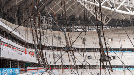 该足球场屋盖采用国内首个平面单层膜轮辐式索膜结构体系,这张形似 “巨型自行车轮” 的索桁架是索膜结构体系的支撑骨架,未来将张拉高透光 PTFE 膜,为观众提供通透、舒适的观赛环境。