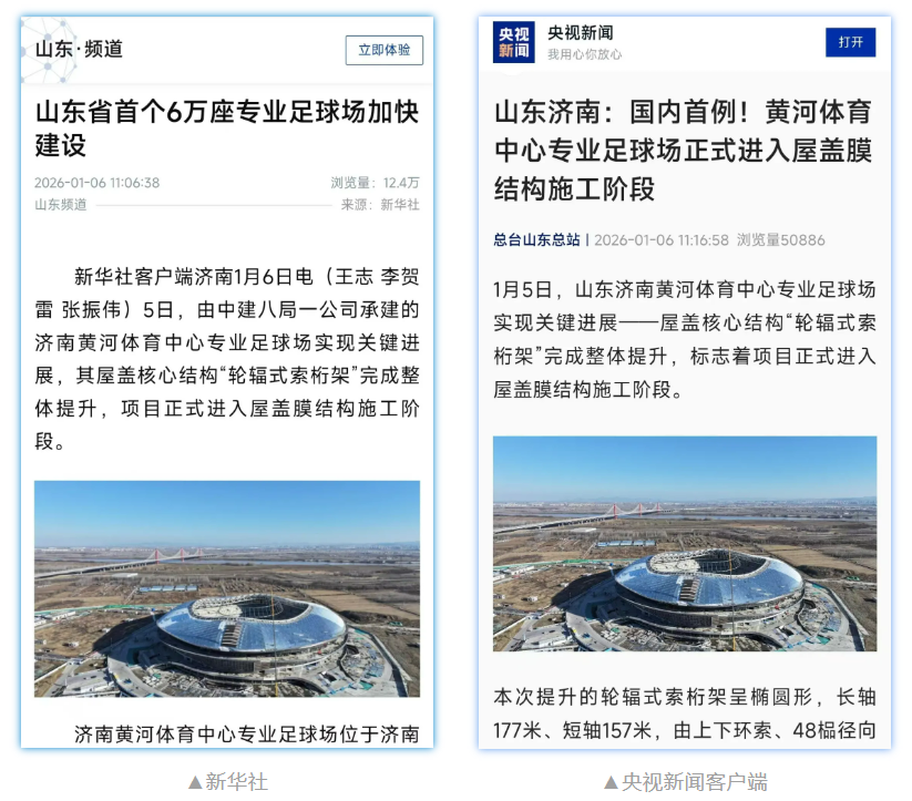 近日,中建八局一公司承建的山东省首个 6 万座专业足球场——黄河体育中心专业足球场项目完成轮辐式索桁架体系吊装,正式进入屋盖膜结构施工阶段,受到新华社、央视新闻等主流媒体报道。