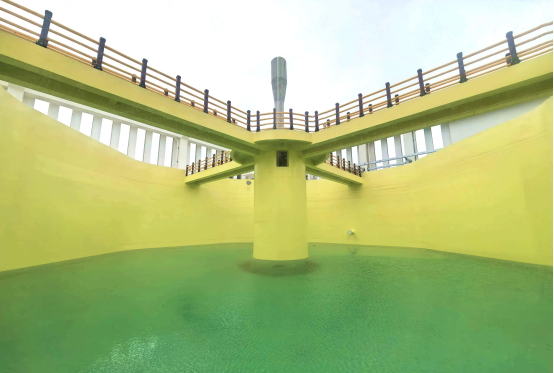 项目养殖池为地上旅游展示结构,陆上总水量达 3.2 万立方米,相较于传统埋入地下的池体,防渗漏要求更高、施工难度更大。项目联合行业内专家学者,对池体混凝土配合比、钢筋布置开展专项研讨与技术优化,有效提升池体成型质量和防渗能力,创新采用 “玻璃钢 + 金汤水不漏 + 环氧树脂” 的内壁及池底防腐层,管道接缝处增设 3 毫米厚镀锌钢板,将渗漏等结构扰动对育鱼影响降到最低。